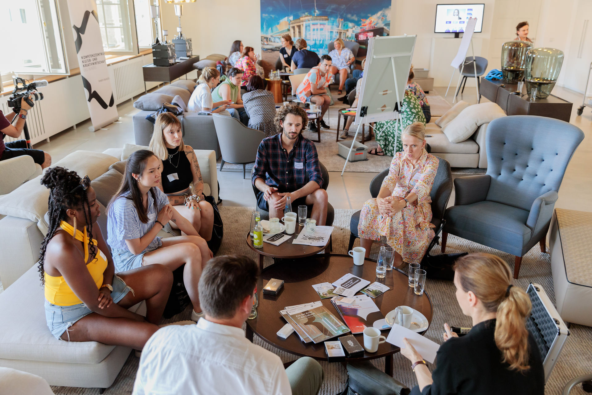 Fachkräftemangel ist eine Problematik, die aktuell viele Branchen beschäftigt. Grundsätzlich sind die Herausforderungen in vielen Bereichen ähnlich und seit langem bekannt. Um dazu transformative Lösungsansätze zu entwickeln, hat das Kompetenzzentrum 2023 die Ausgangslage aus unterschiedlichen Perspektiven betrachtet und sich mit den dahinterliegenden Strukturen auseinandergesetzt. Zentrale Fragestellungen waren dabei: „Was braucht die Kultur- und Kreativwirtschaft?“ und „Welchen Beitrag kann die Branche leisten?“. Um im ersten Schritt die Branchenbedarfe zu konkretisieren und die vielfältigen Perspektiven der Kultur- und Kreativwirtschaft sichtbar werden zu lassen, gründete das Kompetenzzentrum ein Aktionsnetzwerk Fachkräftegewinnung, bestehend aus Akteur*innen der Branche und Expert*innen unterschiedlicher Disziplinen, und knüpfte Arbeitsbündnisse mit verschiedenen Institutionen (u.a. der Bundesagentur für Arbeit). Anschließend wurden die Formate Creative Lab und Innovation Camp des Kompetenzzentrums als Experimentierräume genutzt, um gemeinsam nachhaltige Modelle und Prototypen zu entwickeln, die konkrete Lösungsangebote zu den Herausforderungen darstellen. Aus der interdisziplinären Zusammenarbeit bestehend aus Design Sprints, Szenariotechniken und einem fortwährenden Austausch auf Augenhöhe sind 7 Prototypen und niedrigschwellige Lösungsmodelle entstanden, die einfach umsetzbare Antworten auf folgende drei Herausforderungen bieten: